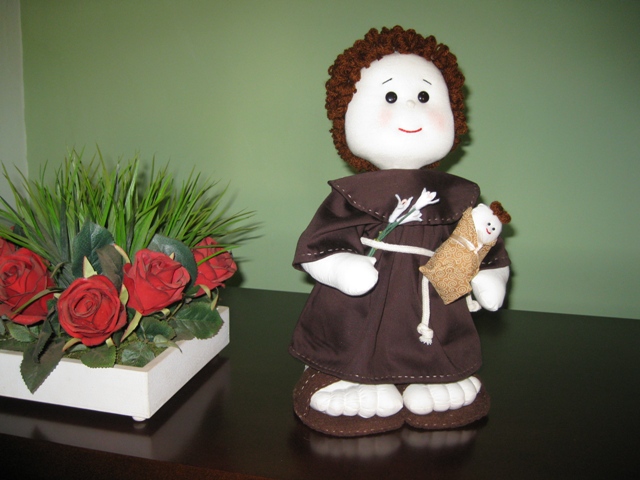 A sobrinha do meu marido vai casar e fiz o Santinho para ela jogar pois está super na moda hehehehe, nossa, mas deu muito trabalho, na verdade fiz um primeiro que não gostei do rostinho dele, aí fiz outra cabeça, mas ficou um super cabeção, ela tá guardada para eu fazer um corpão, aí fiz outra cabeça e outro corpo, e aí está ele finalizado.