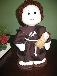 A sobrinha do meu marido vai casar e fiz o Santinho para ela jogar pois está super na moda hehehehe, nossa, mas deu muito trabalho, na verdade fiz um primeiro que não gostei do rostinho dele, aí fiz outra cabeça, mas ficou um super cabeção, ela tá guardada para eu fazer um corpão, aí fiz outra cabeça e outro corpo, e aí está ele finalizado.